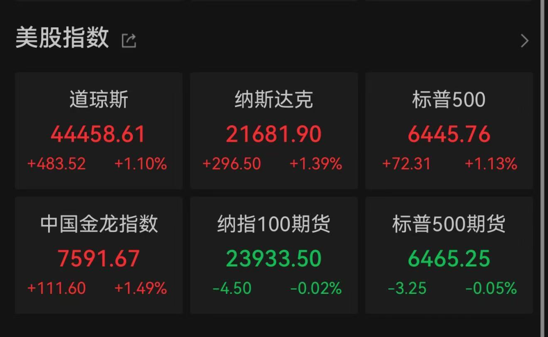 截至收盘,标普500指数上涨1.13%,报收于6445.76点;纳斯达克综合指数上涨1.39%,报收于21681.9点;道琼斯工业指数涨1.1%,报收于44458.61点。