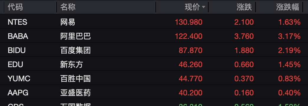 此外,网易上涨1.63%,阿里巴巴上涨3.17%,百度集团上涨2.19%。