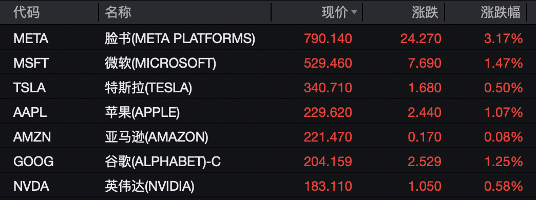 大型科技股再度上涨,脸书上涨超3%,微软、谷歌和苹果均涨超1%。英伟达、Meta股价创下历史新高。