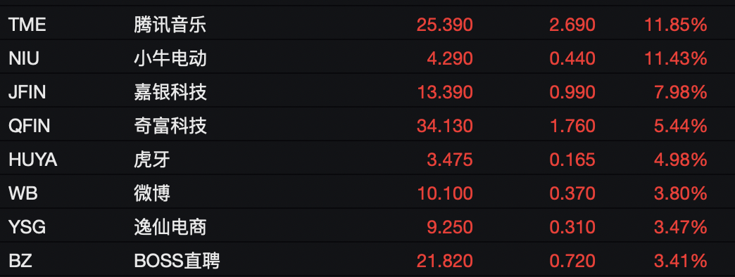 腾讯音乐、小牛电动涨超10%,奇富科技上涨超5%。