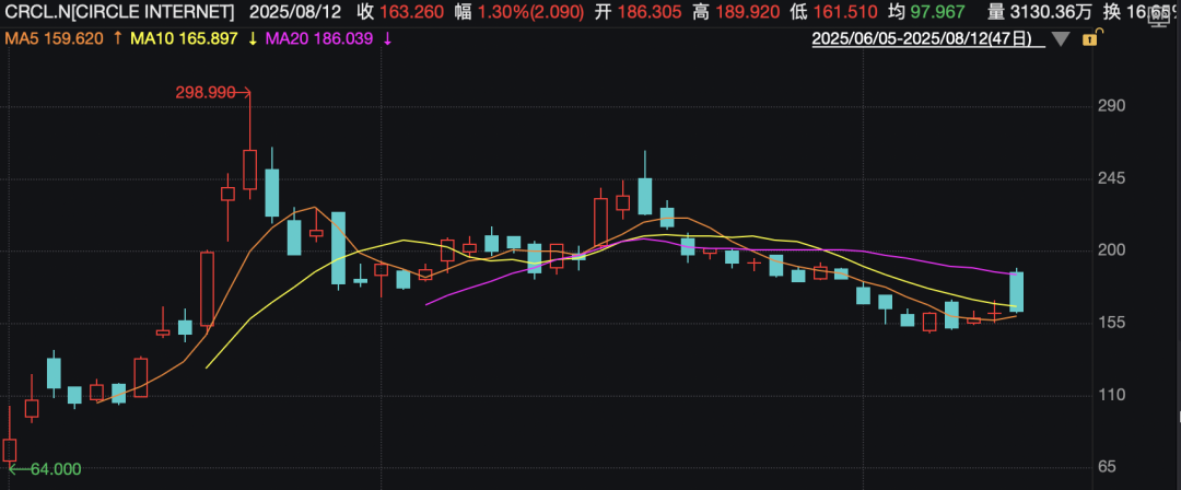 截至8月12日收盘,Circle当日上涨1.30%。自6月5日上市以来,Circle股价自83.23美元/股上涨至163.26美元/股。