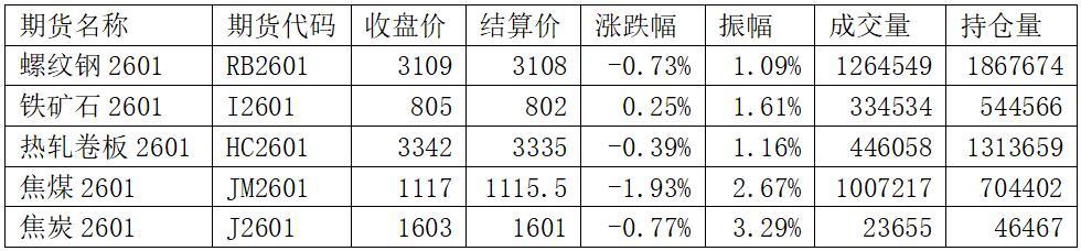螺纹钢2601收盘于3109元/吨,跌幅0.73%,持仓量1867674手,较前一个交易日增加88845手;铁矿石2601收盘于805.0元/吨,涨幅0.25%,持仓量544566手,较前一个交易日增加3366手。Rb2601合约成交持仓龙虎榜显示,前20家多头席位持仓1091032手,前20家空头席位持仓1212449手,净持仓-121417手,为净空头状态。本周建材成交有所回升,上周建材日均成交值为9.696万吨,9月8日成交11.27万吨,环比上周增加16.23%;9月9日成交10.14万吨,环比上周增加4.6%。铁矿石在经历昨日的几内亚西芒杜铁矿建厂的影响之后,今日未能再创新高,钢厂利润回落背景下,铁矿恐难以长时间维持高位。9月8日焦炭第一轮提降全面落地,目前钢厂依旧有第二轮提降的预期。市场仍处于弱现实的局面,短期螺纹钢或弱势整理运行。