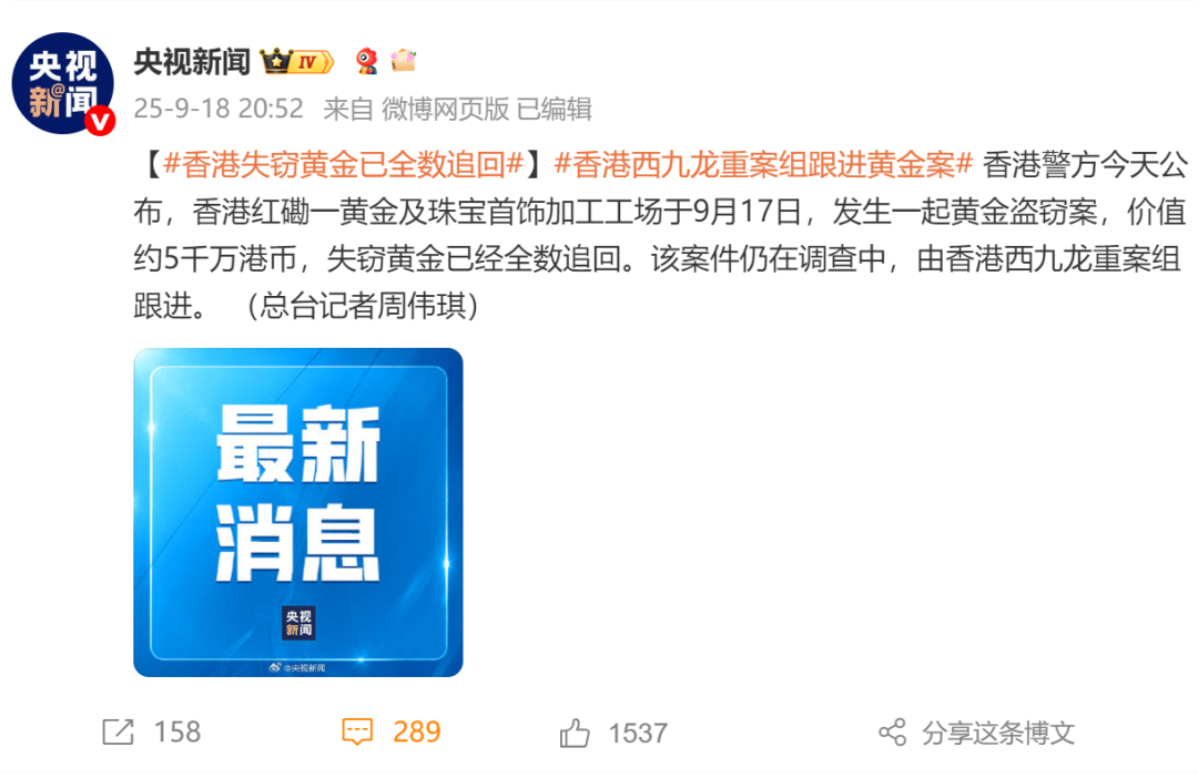 据央视新闻9月18日消息,香港警方今天公布,香港红磡一黄金及珠宝首饰加工工场于9月17日,发生一起黄金盗窃案,价值约5千万港币,失窃黄金已经全数追回。该案件仍在调查中,由香港西九龙重案组跟进。