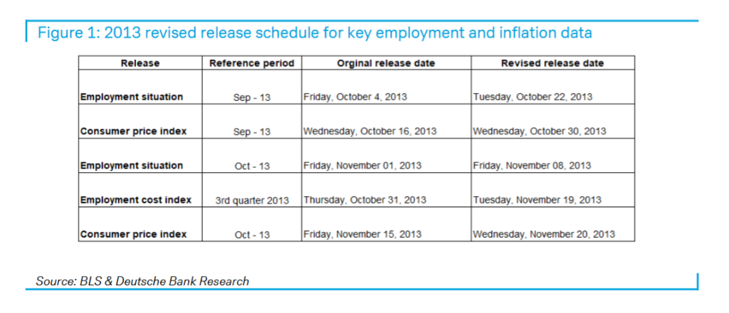 这意味着,备受关注的就业报告和消费者价格指数(CPI)等关键数据将无法按时公布。报告回顾了2013年的情况,当时9月和10月的就业与CPI数据均被重新安排,数据发布的混乱一直持续到当年12月。更糟糕的是,劳工统计局当时承认,用于计算2013年10月CPI指数的价格样本量仅为正常水平的75%。