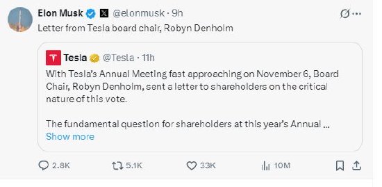 马斯克在他的社交平台X上转发了特斯拉官方账号分享的丹霍尔姆的致股东信。
