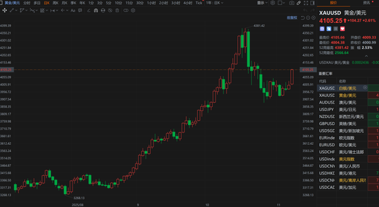 昨日,现货黄金价格持续走高,美股盘前向上突破4100美元/盎司,为10月27日以来首次,日内涨超2.6%。纽约期金价格同样突破4100美元/盎司,涨2.32%。现货白银(8131-9.00-0.11%)价格涨逾3.6%,纽约期银价格大涨4%。