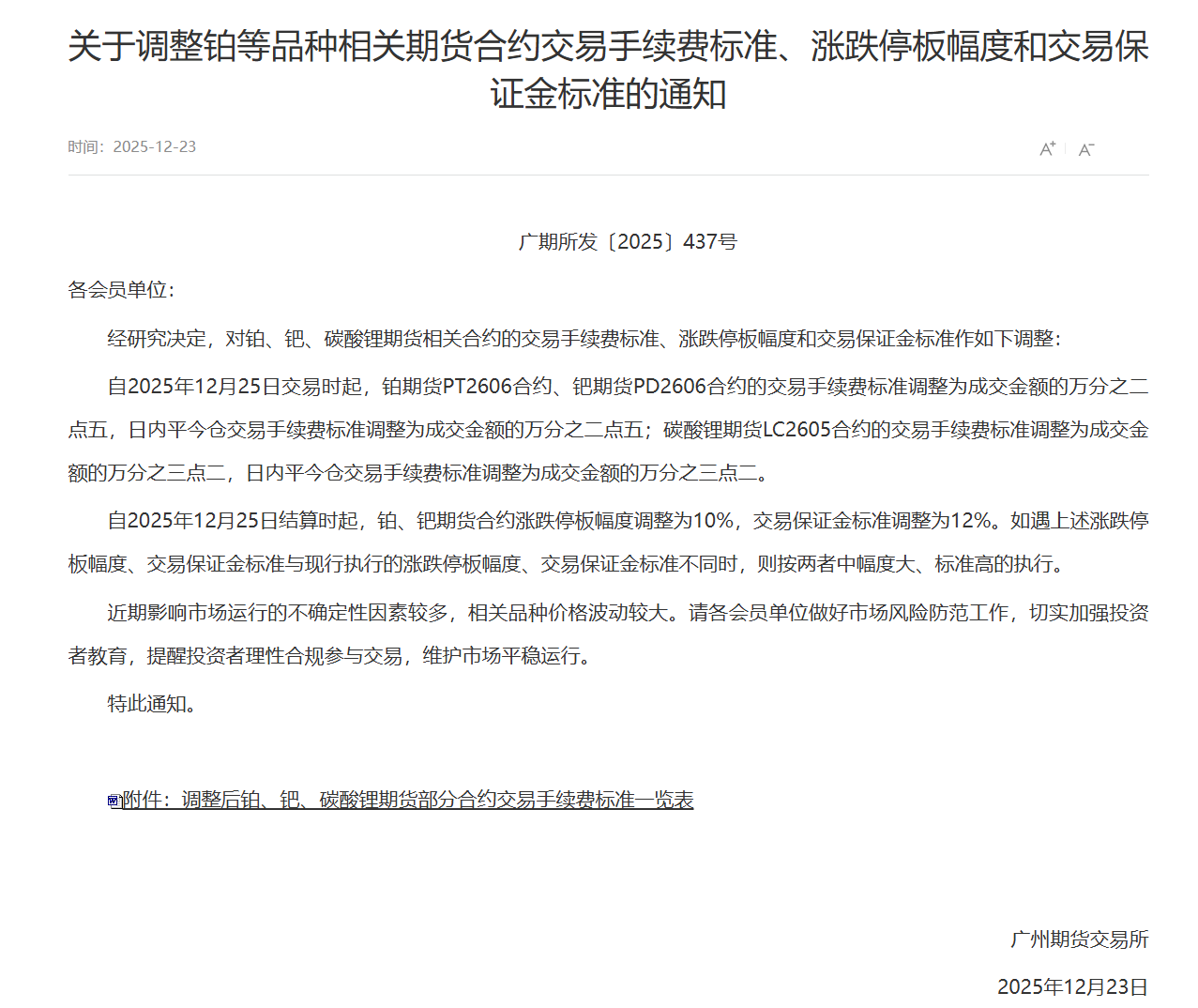 自2025年12月25日交易时起,铂期货PT2606合约、钯期货PD2606合约的交易手续费标准调整为成交金额的万分之二点五,日内平今仓交易手续费标准调整为成交金额的万分之二点五;碳酸锂期货LC2605合约的交易手续费标准调整为成交金额的万分之三点二,日内平今仓交易手续费标准调整为成交金额的万分之三点二。