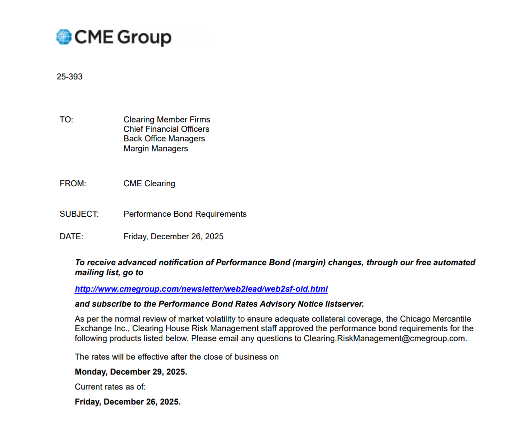 消息面上,芝商所集团上周五发布保证金调整通知,全面上调白银、黄金、铂金、钯金、碳酸锂等近期热门合约的期货及对应结算价交易合约(TAS)的履约保证金。新的保证金要求于周一(12月29日)收盘后生效。