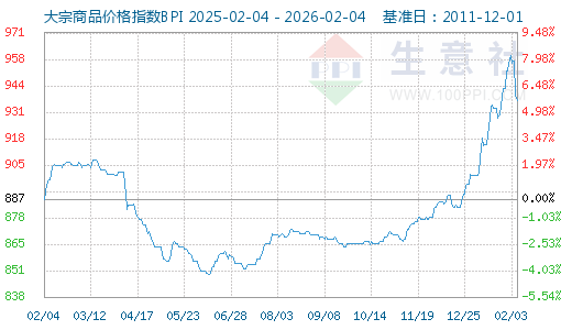 2月3日大宗商品价格指数BPI为937点, 较昨日下降了3点 , 较周期内最高点1343点(2021-10-19)下降了30.23%,较2016年02月03日最低点660点上涨了41.97%。