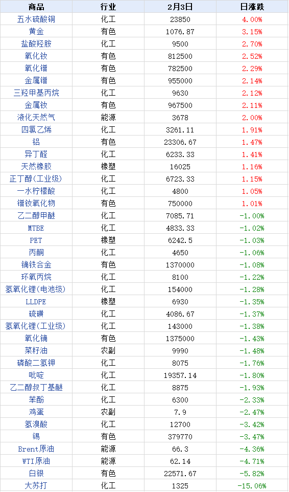 据生意社价格监测,2026年2月3日大宗商品价格涨跌榜中环比上升的商品共46种,集中在化工板块(共22种)和有色板块(共10种),涨幅前3的商品分别为五水硫酸铜(4.00%)、黄金(5828.801.54%)(3.15%)、盐酸羟胺(2.70%)。环比下降的商品共73种,集中在化工(共33种)和有色(共9种),跌幅在5%以上的商品主要集中在化工板块;跌幅前3的商品分别为大苏打(-15.06%)、白银(8131-9.00-0.11%)(-5.82%)、WTI原油(607-8.60-1.40%)(-4.71%)。